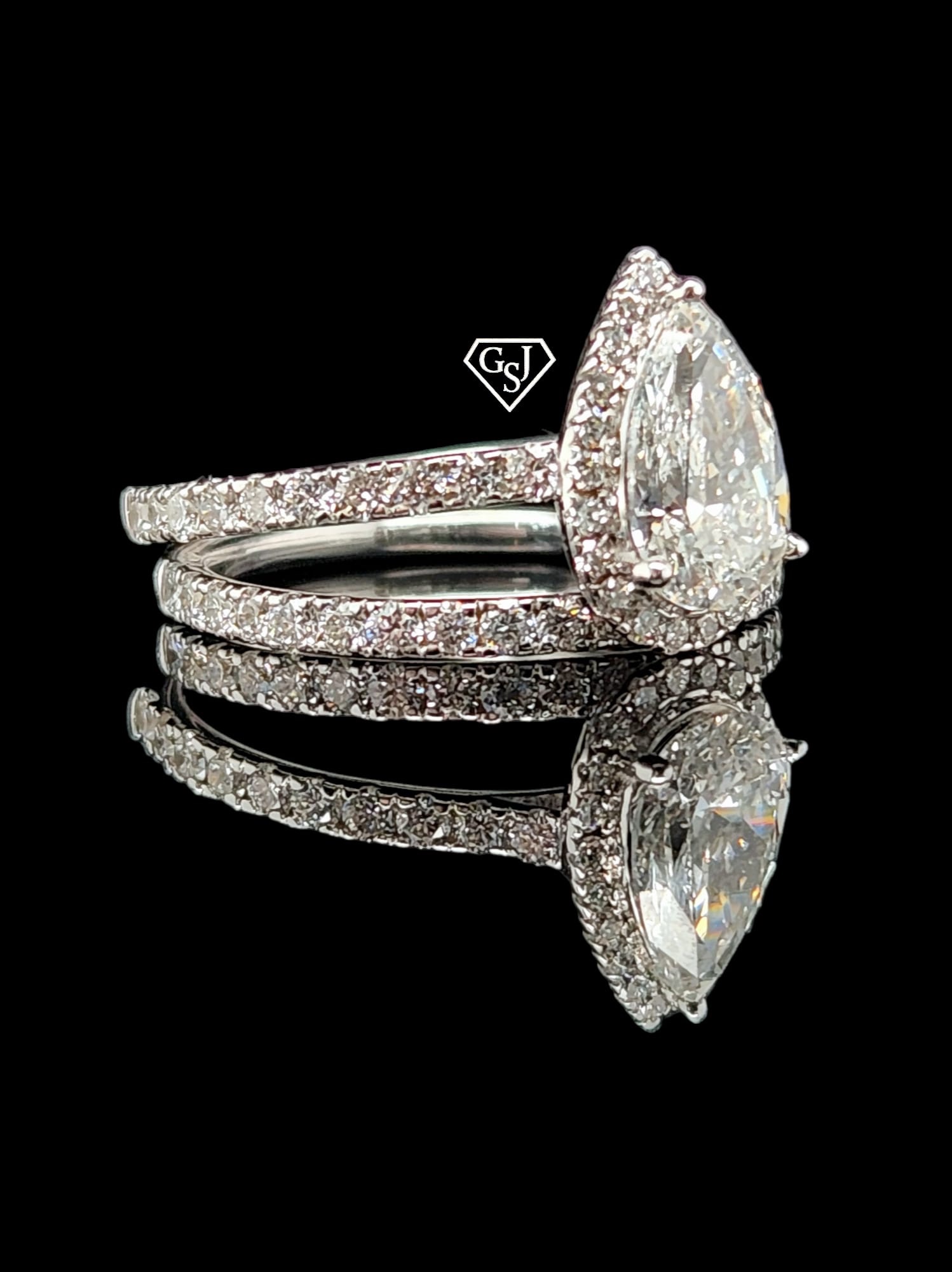 14K gold wedding set features a 1.17CT pear shaped center diamond