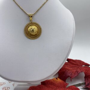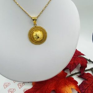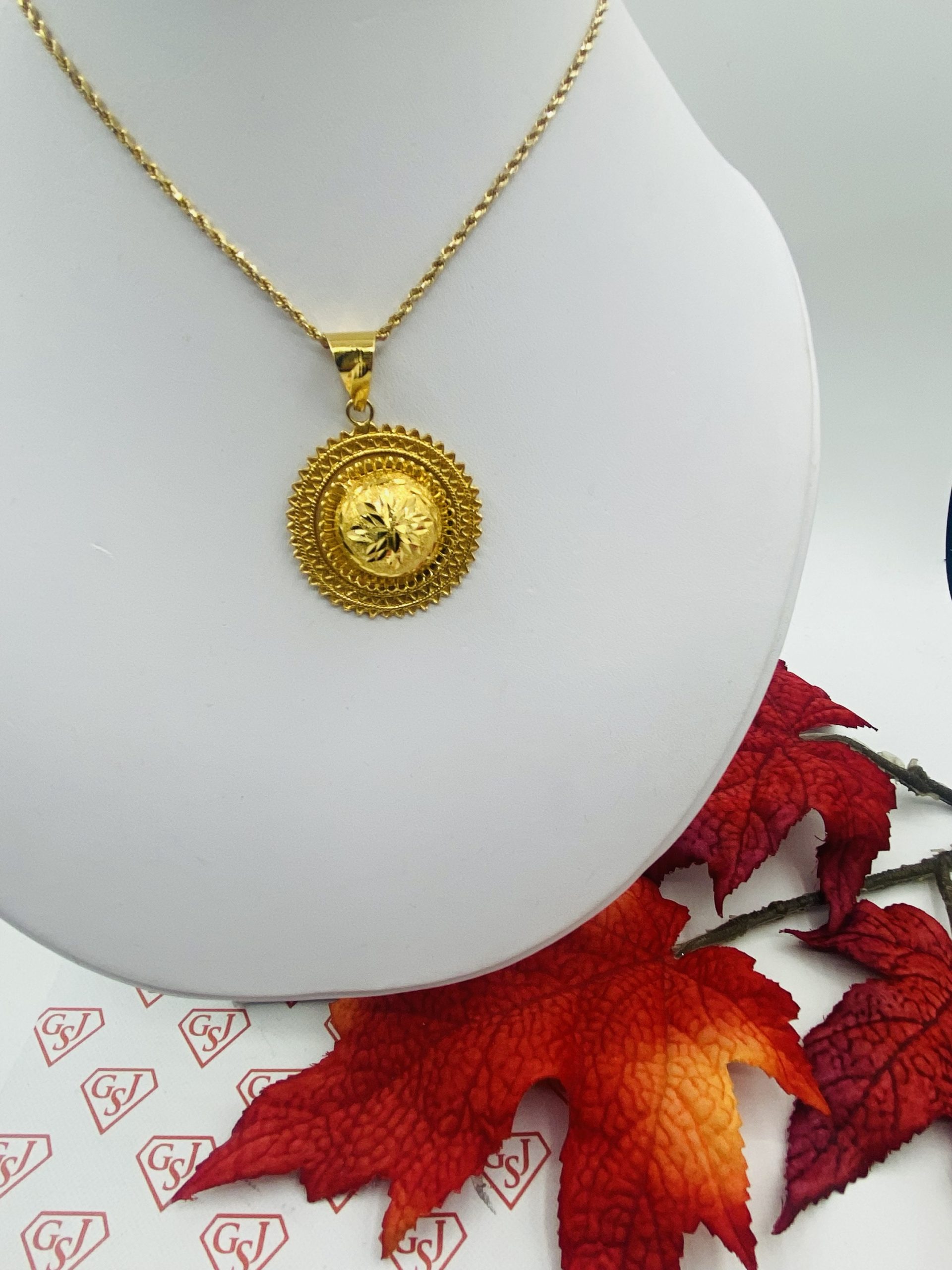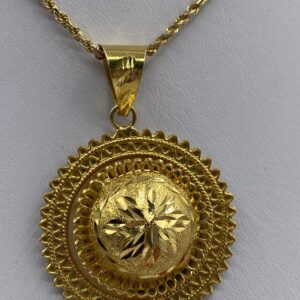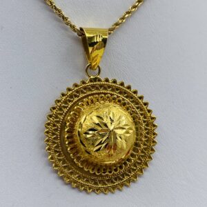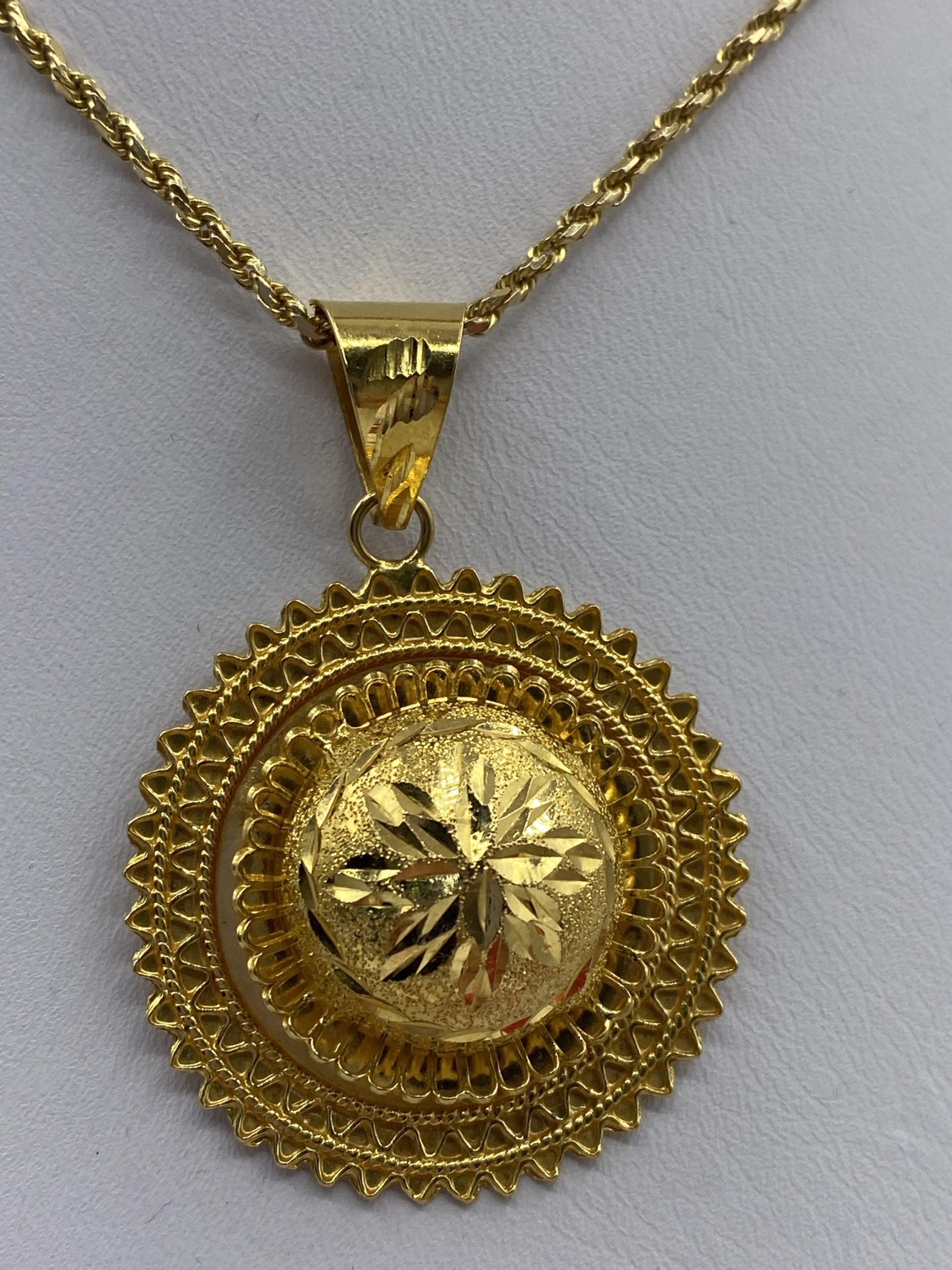 This chain and pendant are solid 22/21k .the chain is 21k and 26″ long and weighs in at 10grams the pendant is 22k and weighs in at 8.4 grams total weight together is 18.4 grams