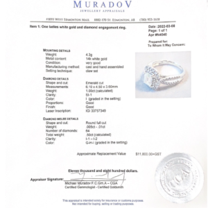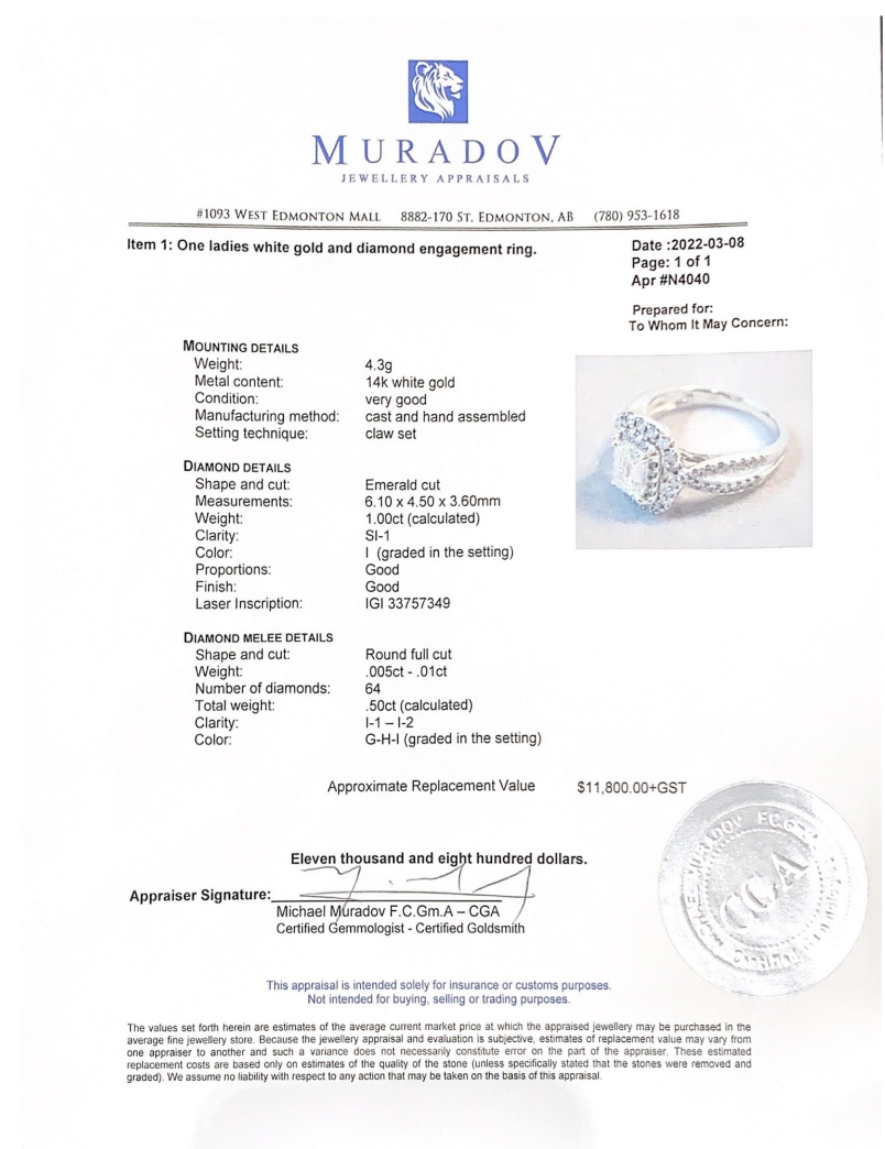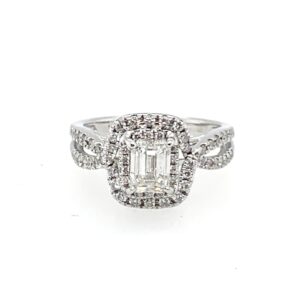 Check out this stylish emerald cut engagement ring featuring a one carat center earth mined diamond.